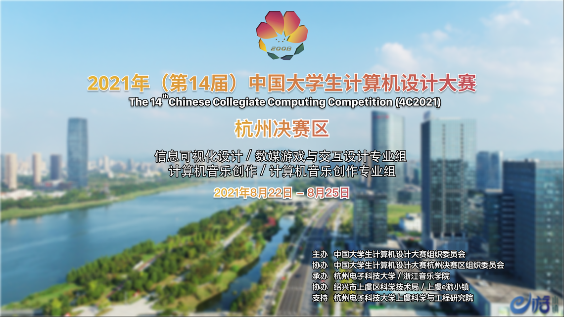 2021年开始,大赛采用二级分赛区制,目前全国设六个决赛区,杭州电子科技大学是杭州决赛区的负责单位,承担信息可视化设计、数媒游戏与交互设计专业组、计算机音乐创作和计算机音乐创作专业组四个大类。今年由杭州电子科技大学/浙江音乐学院承办,绍兴市上虞区科学技术局/上虞e游小镇协办。